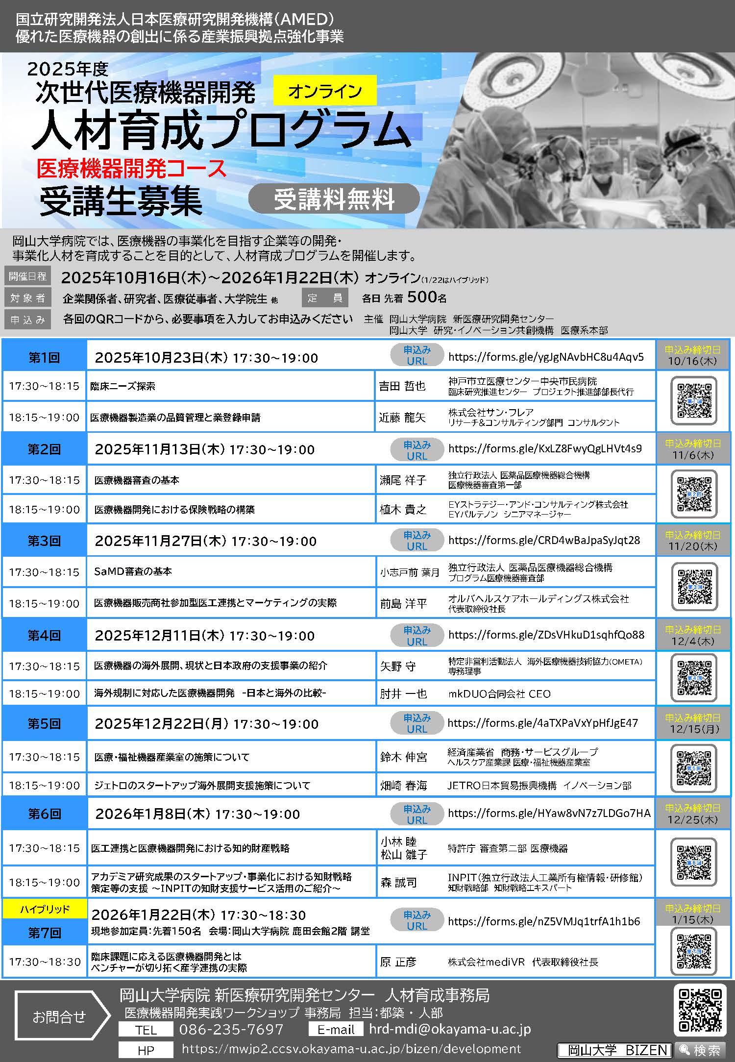 医療現場における課題を解決すべく新たな医療機器の開発・事業化を目指している企業の方、医療機器に関する研究を行う学生・コメディカル、医師・歯科医師を対象としてセミナーを開催し、次世代を担う若手研究者、開発者の育成を支援します。
