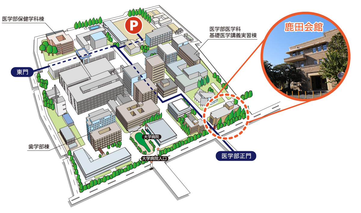 • お車でお越しの方は、医学部正門または東門からお入りください。大学病院入口は患者様専用です。